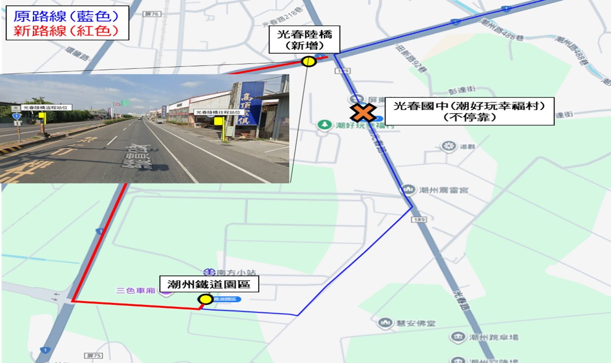 - 經(jīng)當(dāng)?shù)馗鳈C(jī)關(guān)單位會(huì)勘後,因光春路往潮州鐵道園區(qū)大客車(chē)通行有安全疑慮,不???strong>「光春國(guó)中」站,自115年3月2日起試辦不停靠3個(gè)月,試辦期滿後,倘無(wú)民眾不良反映則正式撤站。